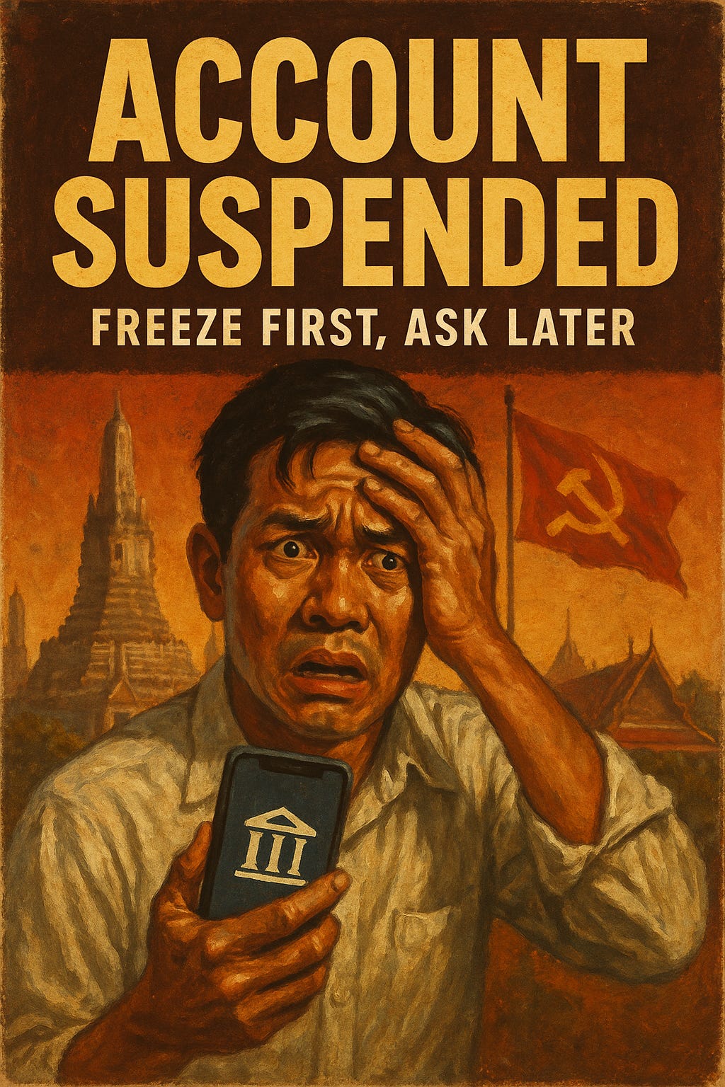 Account SuspendedFreeze First, Ask LaterKNO-SJKSep 25, 2025ShareThailand acts. Banks panic. Lock doors. Freeze accounts. Funds vanish. Blame fraud.Paper shields. Broken vaults.Officials preach. Issue decrees.New powers. Old fears.Quick patch. Deep cracks.Tight leash. Trust collapses.Scammer dismay. Move fast.Shift trails. Stay ahead.Global wires. Cross-border fear.Hot money. Cold welcome.System shakes. Markets twitch.Policy circus. Investors hedge. Apps fail. Cash reigns.Capital flees. Thailand sweats.It’s law. It’s order. It’s chaos. Controlled demolition.Power grows. Process shrinks.Freeze first. Ask later.Thanks for reading Chaos, Corruption, and a Cappuccino! Subscribe for free to receive new posts and support my work.SubscribePreviousNext