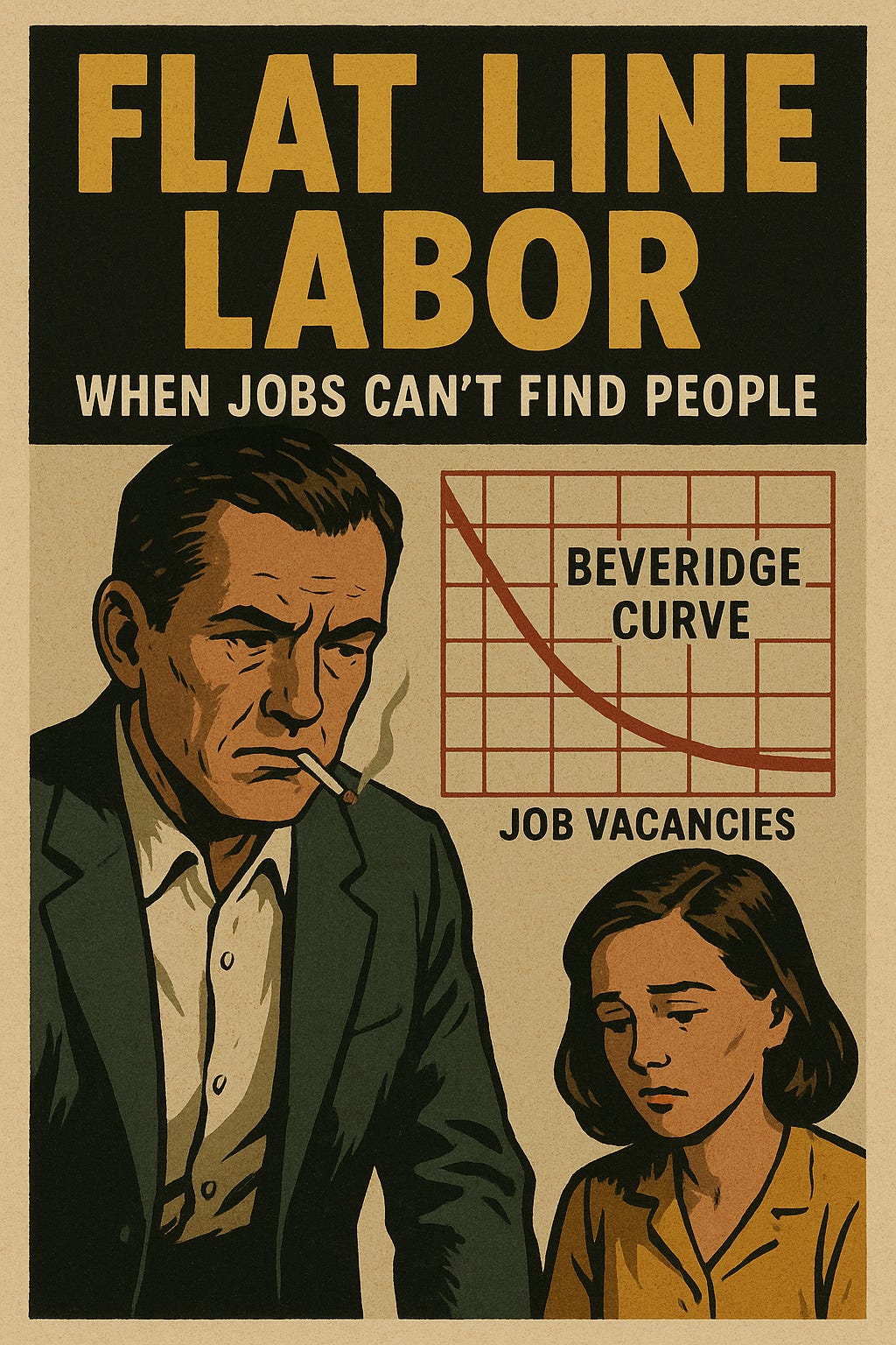 Flat Line LaborWhen Jobs Can’t Find PeopleKNO-SJKDec 17, 2025211ShareJobs everywhere. People nowhere.Vacancies scream. Dismissals shrug.College graduates. Basement bound.Charts look sober. Reality strikes.Economists squint. Stats seem off.Markets drift. Main street sags.Beveridge curve. Flat. As a pancake. Help wanted signs. Workers needed. Just elsewhere. Skills misaligned.AI at the root? Maybe. Unknown.Training promised. But yesterday.Delivery missed. Likely forever.Policy clicks options. No moves.Rates cut. Few hired yet. Officials worry. Workers weep.Recruiting stalls. Digital job ads.Thousands apply. Keywords match.HR swamped. AI vets harshly.Numbers lie. People drift angrily.Everybody waiting. No matches.The curve flattens. As does hope.Thanks for reading Chaos, Corruption, and a Cappuccino! Subscribe for free to receive new posts and support my work.SubscribePreviousNext