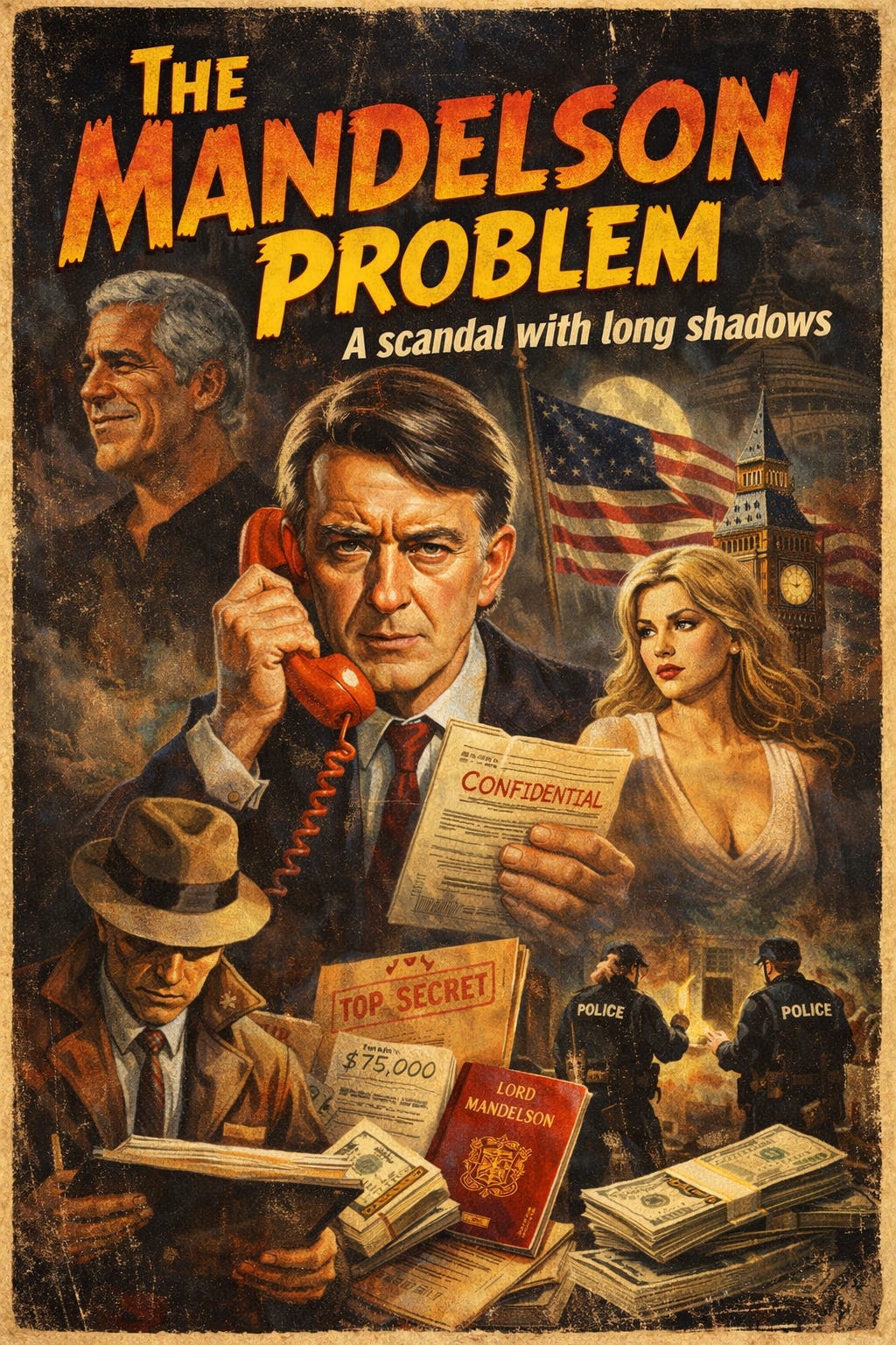 The Mandelson ProblemA scandal with long shadowsKNO-SJKFeb 09, 20261ShareWestminster smoke. Morning lies.PM smiles. Teeth clenched.Old fox returns. Now new mess.Diplomats sip. Acidic tea.Emails flutter. Black confetti.Names drop. Shimmer like pennies.Vetting? A nap. Even briefer.Integrity sells. Two-for-one sale.Lords mutter. Lawyers bloom.Press hounds howl. Meat scented.Police tape gleams. Stage lights.Truth sweats. Beneath hot bulbs.Washington calls. Line crackles.Friendly emails. Public blushes.Handshake photos. Crooked angles.Trade talk drifts. Deep into fog.Backbenchers sharpen. Silent knives.Irishman quits. Takes the fall.Opposition grins. Feeds the fire.Standards sermon. A hollow bass.Street shrugs. Pints raised.Public asks. Who knew?Clean hands promised. Ink stains.Next scandal loads. Same shotgun.Thanks for reading Chaos, Corruption, and a Cappuccino! Subscribe for free to receive new posts and support my work.SubscribePreviousNext
